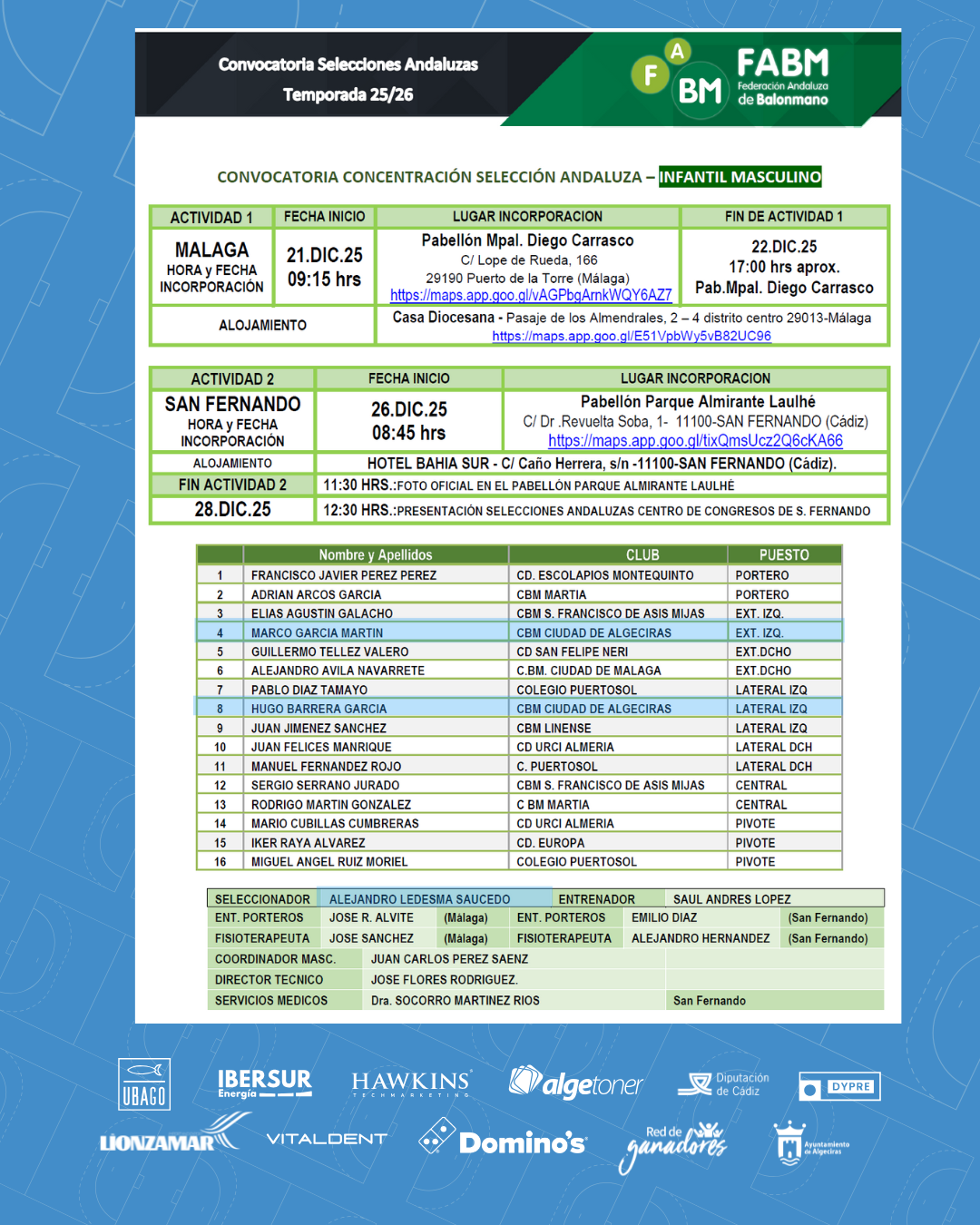Leer másLa Comisión Técnica de la Federación Andaluza de Balonmano, ha convocado a los/as jugadores/as, que se detallan en los archivos adjuntos, a la Jornada de tecnificación categoría PROMESAS INFANTIL MASCULINA. La actividad se desarrollará el próximo día 23 de noviembre de 2025, en el Pabellón Diego Carrasco de Málaga, en